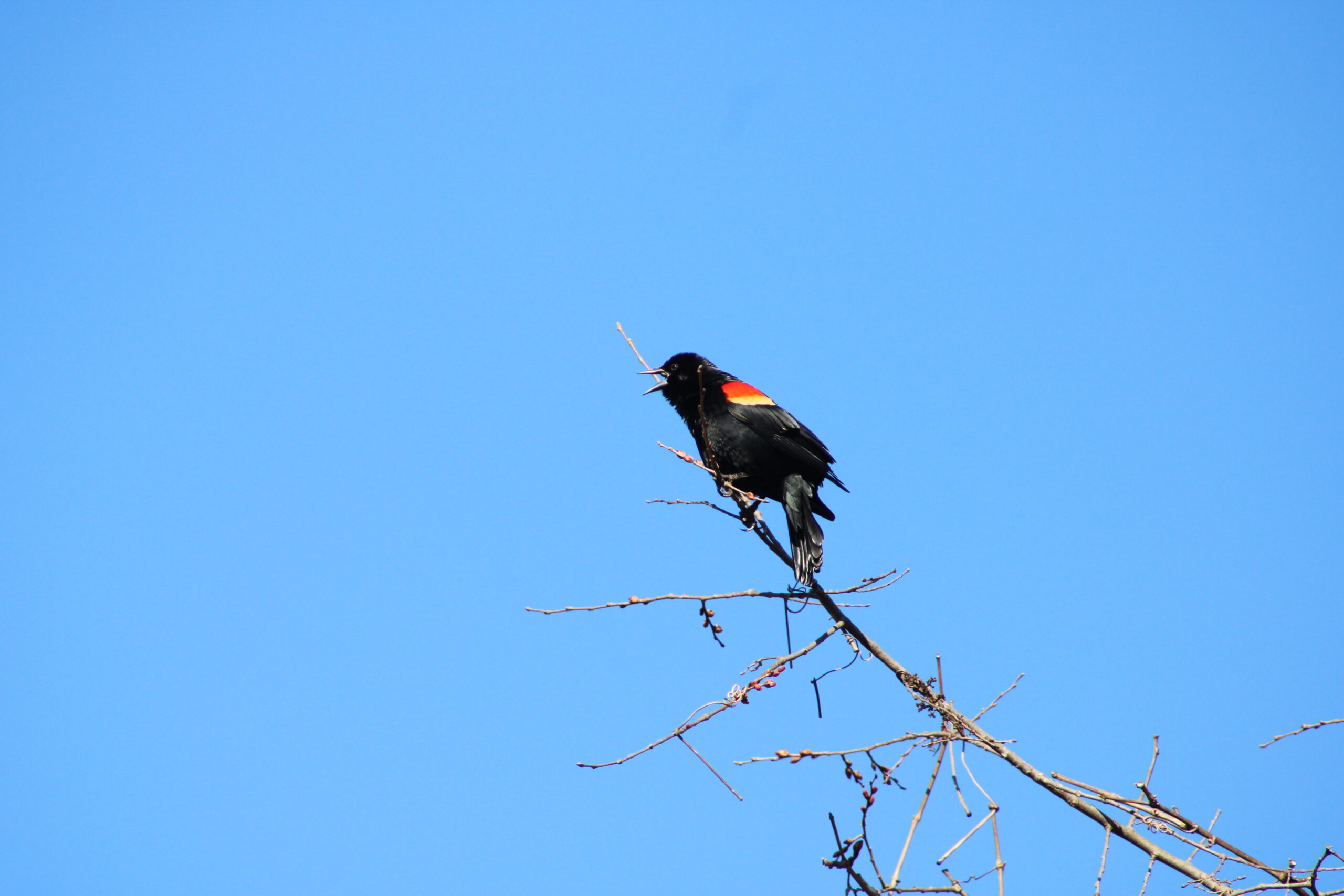 Often thought of as being a herald for spring with its boisterous conk-la-ree song. Maybe a surprise to some, this species is a year-round resident in the state, but most populations tend to migrate south during the winter. With the return of wintering populations, breeding season begins in early March in marshes, wetlands and fields. Males have two scarlet, yellow epaulets and a glossy black body. In stark contrast, females are brown and densely streaked, almost appearing as a large sparrow.