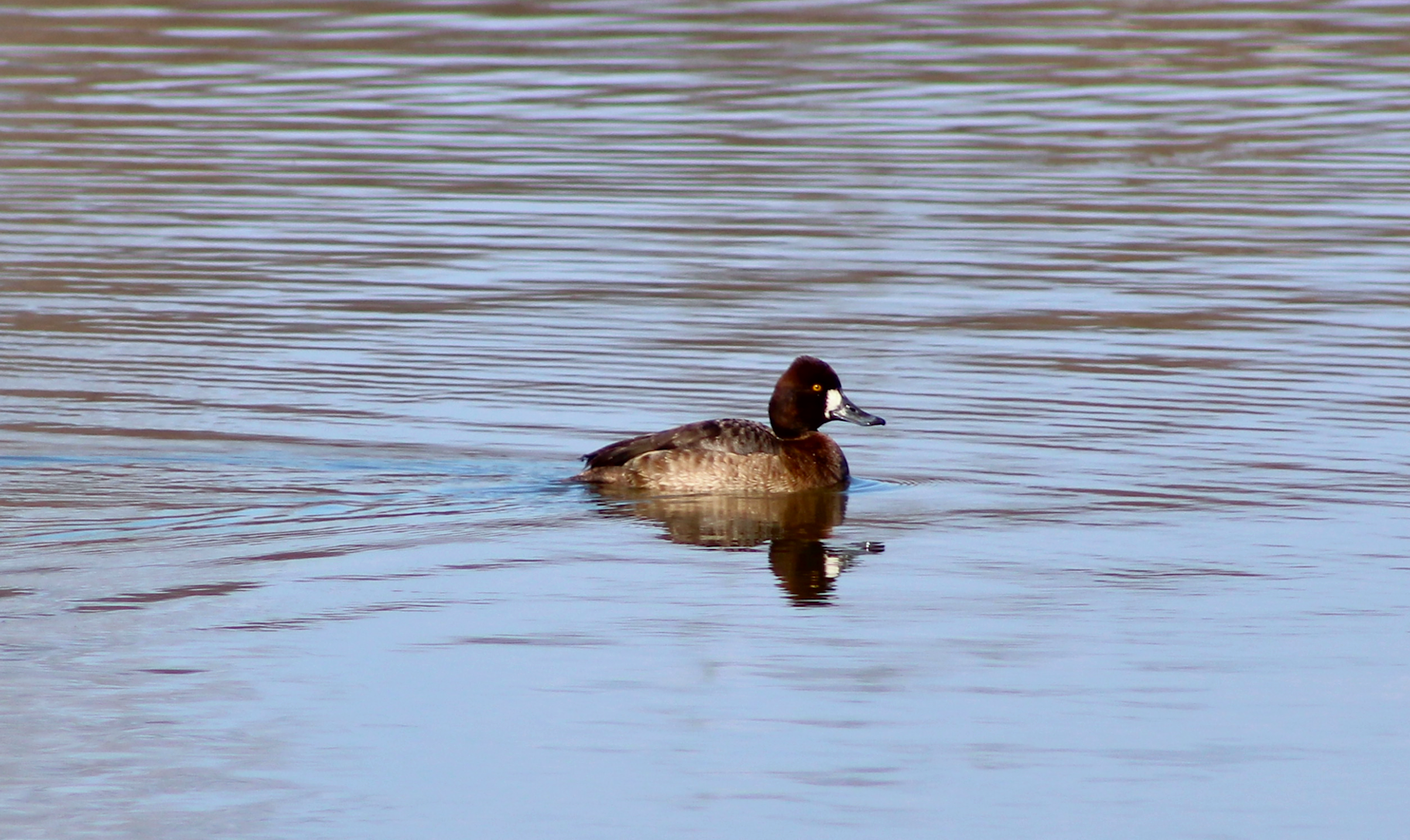 One of the multiple diving duck species from the Aythya genus that migrate through Ohio during the late fall, winter and spring. Both males and females have yellow eyes, but males are white and black, while females are various shades of brown. One of the more difficult species of duck to properly identify due to its strikingly similar counterpart, the Greater Scaup. Key differences in lesser scaups are their peaked crowns, narrower bills and slightly smaller size.