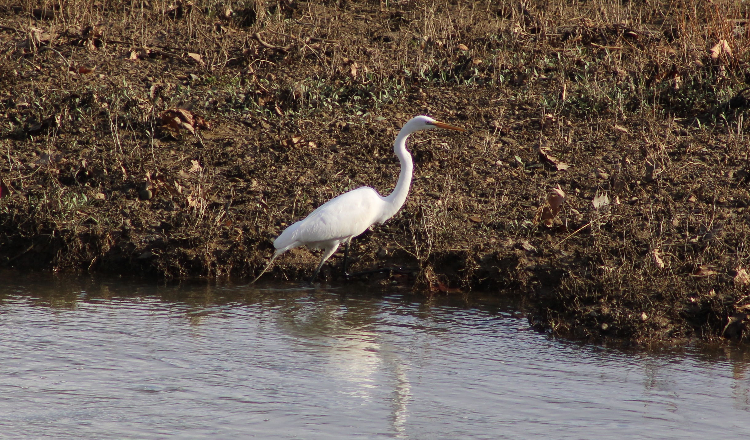 A large, white wading bird with a neck curved like an S. Great Egrets have a sharp yellow bill, which they use to jab into the water to hunt their prey. Distinguishable from the all-white Great Blue Heron by its black legs. Breeding adults have flashy plumes of feathers that are used in courtship displays during the spring and summer. Nearly hunted to extinction in the nineteenth century for the feathers to be used for fashion. Today, they can be found across Ohio during migration and on every continent except for Antarctica.