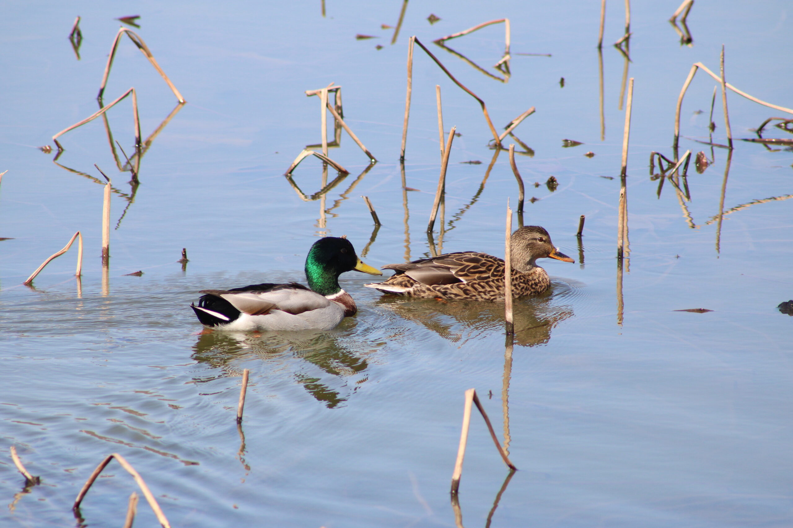 A particularly common duck species found year-round across Ohio. Populations exist across most of North America and Eurasia. Seen more often than not in any area of water, raucously chattering and quacking. Females quack and males do not. Mallards are social ducks that favor flocking together, often intermixing with other species. Males have a distinctive green head, yellow bill, mocha chest and light gray body. Females and juveniles are brown and mottled with an orange bill. Both sexes have a dark blue patch on their wings in flight.
