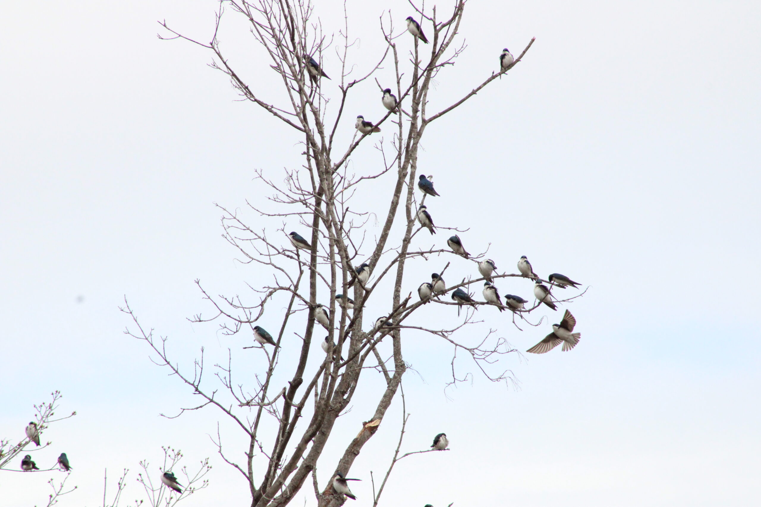 A fluttery, medium-sized swallow species with a flashy white underside. Males have a beautiful green and azure back, while females have a gray-brown back with either slight or no iridescence. Large flocks can be seen during the spring, summer and fall, making acrobatic maneuvers to catch insects over fields and bodies of water. Often heard vocalizing while revolving around in the air. In Ohio, tree swallows show up as early as March and leave as late as November.