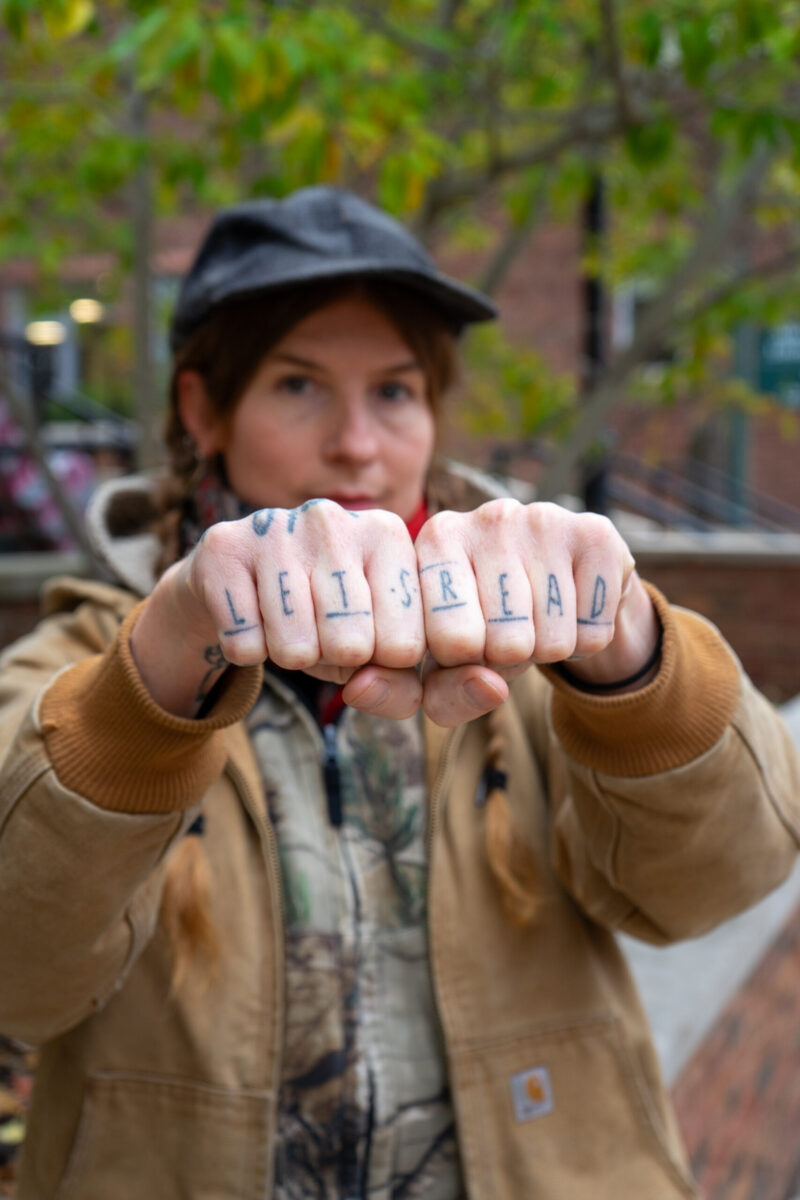 “Literature is something I care a lot about,” ffitch says. “The best way to learn how to write is by reading as many books as you can,” she adds, holding up her hands to show that the letters tattooed across them spell out “Let’s Read.”